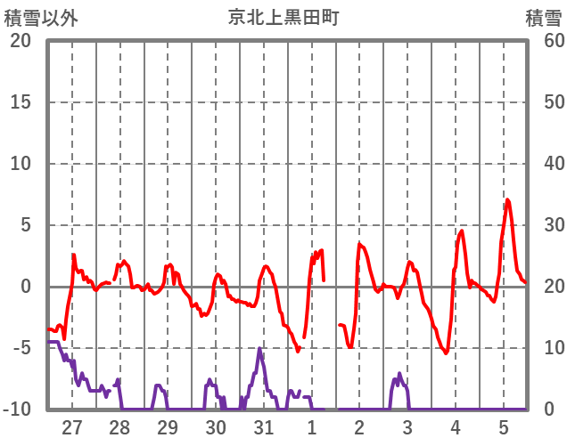| 日 | 時 | 気温 | 降水 | 風向/風速 | 日照 | 積雪 | 降雪 |