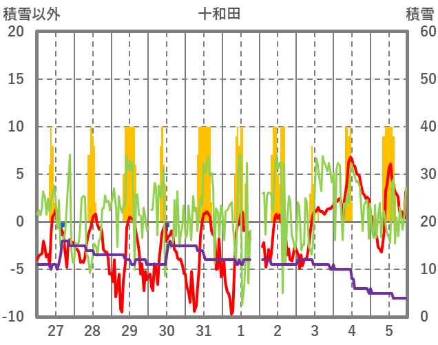 | 日 | 時 | 気温 | 降水 | 風向/風速 | 日照 | 積雪 | 降雪 |