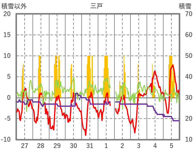 | 日 | 時 | 気温 | 降水 | 風向/風速 | 日照 | 積雪 | 降雪 |