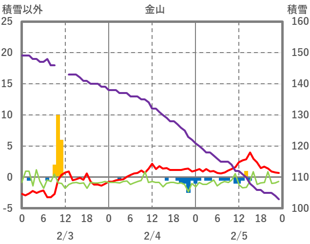 | 日 | 時 | 気温 | 降水 | 風向/風速 | 日照 | 積雪 | 降雪 |