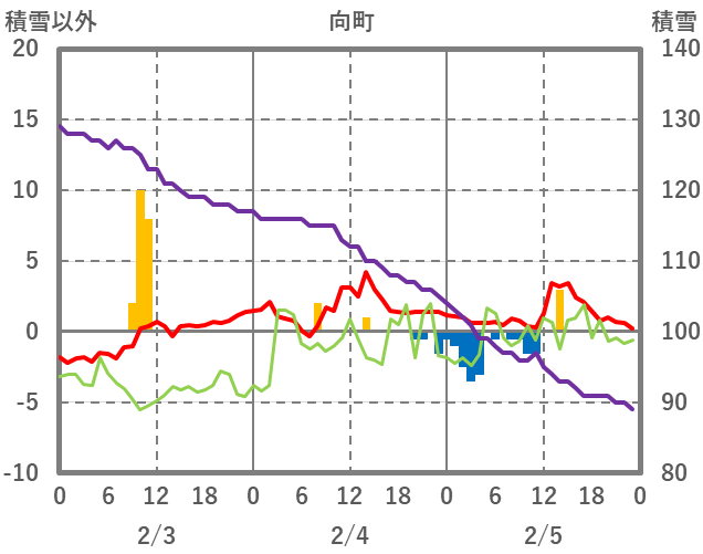 | 日 | 時 | 気温 | 降水 | 風向/風速 | 日照 | 積雪 | 降雪 |