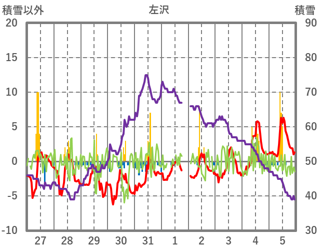 | 日 | 時 | 気温 | 降水 | 風向/風速 | 日照 | 積雪 | 降雪 |