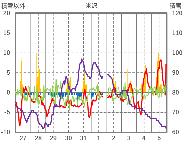 | 日 | 時 | 気温 | 降水 | 風向/風速 | 日照 | 積雪 | 降雪 |
