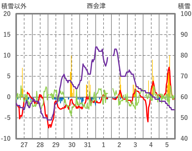 | 日 | 時 | 気温 | 降水 | 風向/風速 | 日照 | 積雪 | 降雪 |