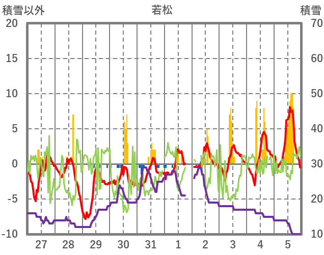 | 日 | 時 | 気温 | 降水 | 風向/風速 | 日照 | 積雪 | 降雪 |