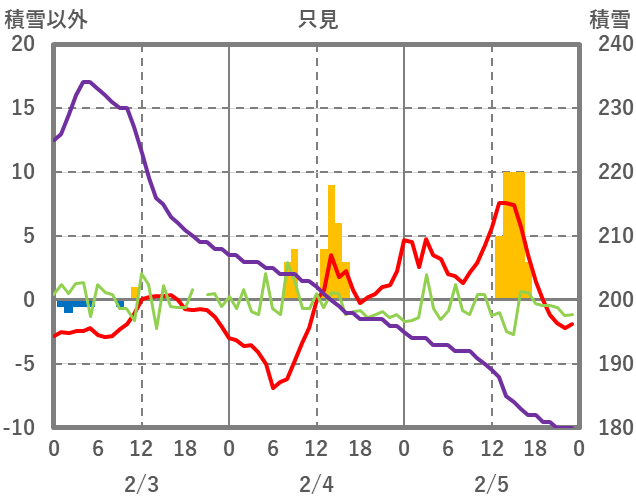 | 日 | 時 | 気温 | 降水 | 風向/風速 | 日照 | 積雪 | 降雪 |