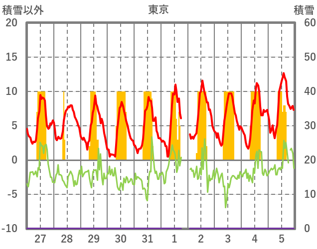| 日 | 時 | 気温 | 降水 | 風向/風速 | 日照 | 積雪 | 降雪 |