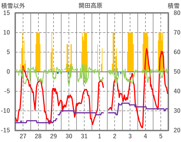 | 日 | 時 | 気温 | 降水 | 風向/風速 | 日照 | 積雪 | 降雪 |