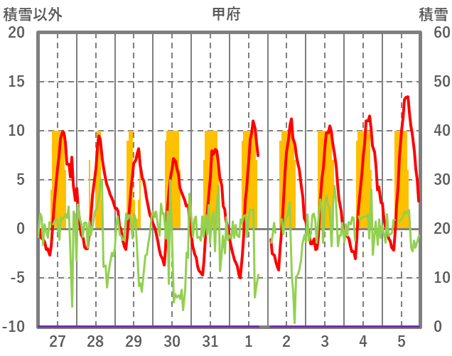 | 日 | 時 | 気温 | 降水 | 風向/風速 | 日照 | 積雪 | 降雪 |