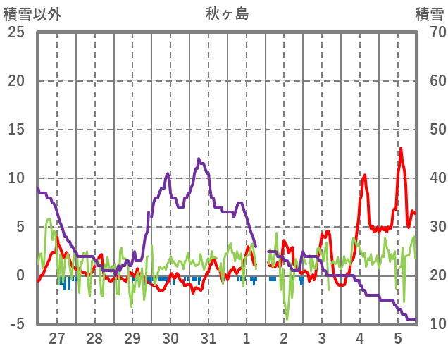 | 日 | 時 | 気温 | 降水 | 風向/風速 | 日照 | 積雪 | 降雪 |