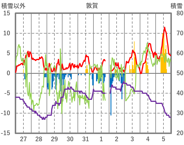 | 日 | 時 | 気温 | 降水 | 風向/風速 | 日照 | 積雪 | 降雪 |