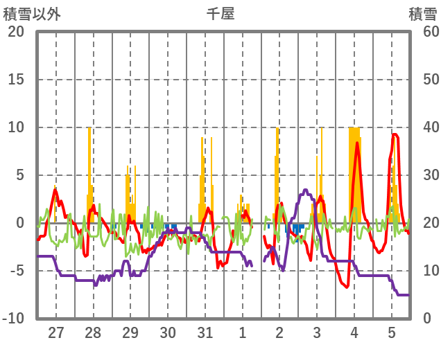 | 日 | 時 | 気温 | 降水 | 風向/風速 | 日照 | 積雪 | 降雪 |
