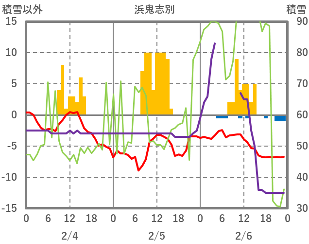 | 日 | 時 | 気温 | 降水 | 風向/風速 | 日照 | 積雪 | 降雪 |