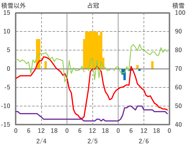 | 日 | 時 | 気温 | 降水 | 風向/風速 | 日照 | 積雪 | 降雪 |