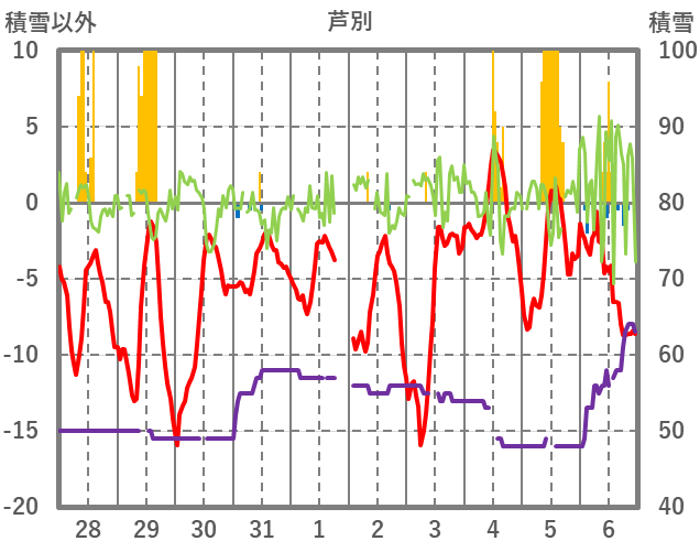 | 日 | 時 | 気温 | 降水 | 風向/風速 | 日照 | 積雪 | 降雪 |