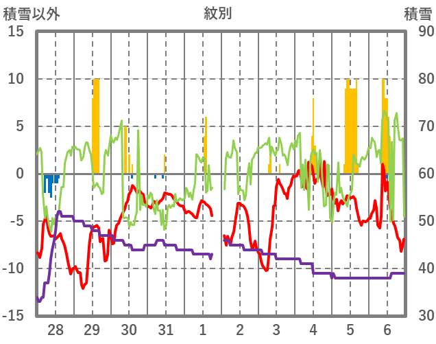 | 日 | 時 | 気温 | 降水 | 風向/風速 | 日照 | 積雪 | 降雪 |