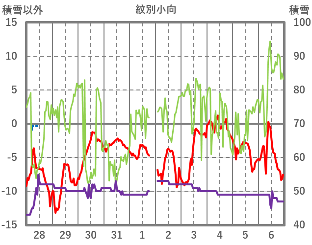 | 日 | 時 | 気温 | 降水 | 風向/風速 | 日照 | 積雪 | 降雪 |