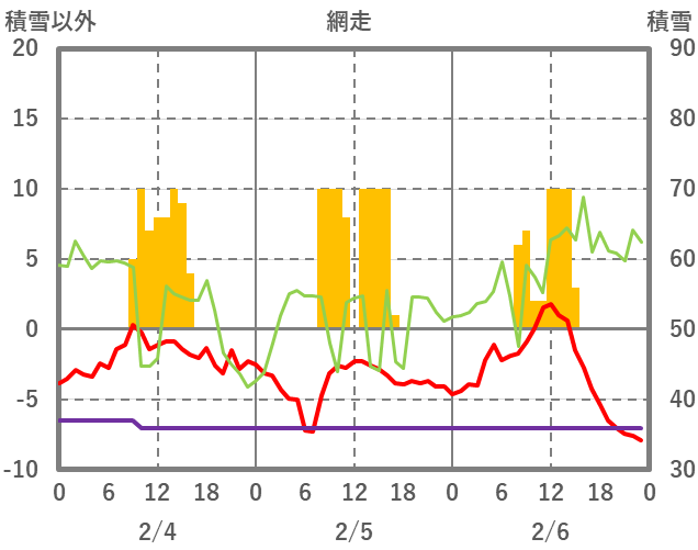 | 日 | 時 | 気温 | 降水 | 風向/風速 | 日照 | 積雪 | 降雪 |