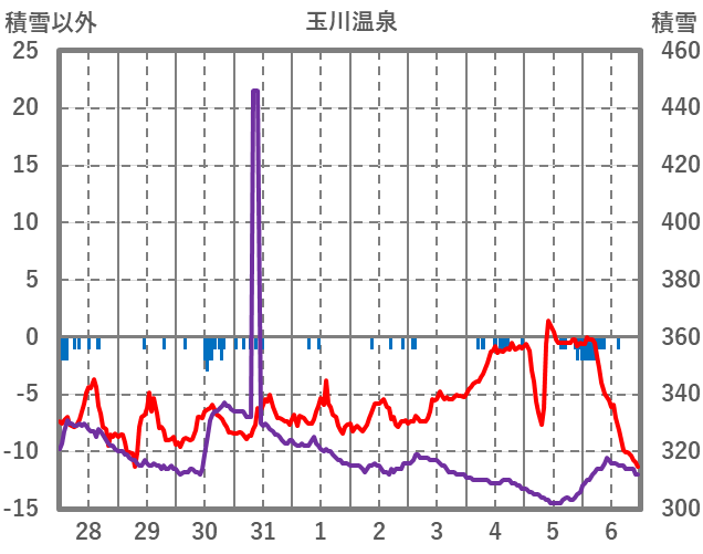 | 日 | 時 | 気温 | 降水 | 風向/風速 | 日照 | 積雪 | 降雪 |