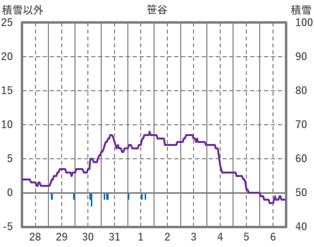 | 日 | 時 | 気温 | 降水 | 風向/風速 | 日照 | 積雪 | 降雪 |