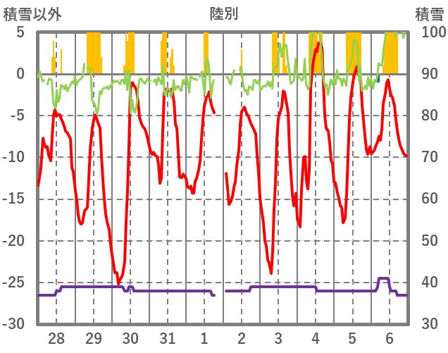 | 日 | 時 | 気温 | 降水 | 風向/風速 | 日照 | 積雪 | 降雪 |