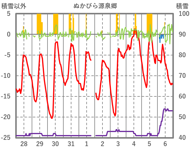 | 日 | 時 | 気温 | 降水 | 風向/風速 | 日照 | 積雪 | 降雪 |