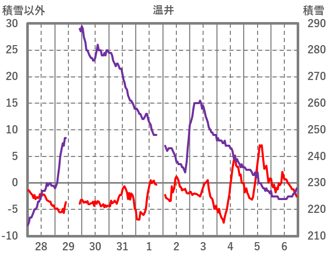 | 日 | 時 | 気温 | 降水 | 風向/風速 | 日照 | 積雪 | 降雪 |