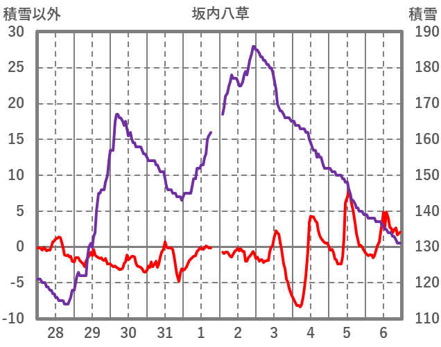 | 日 | 時 | 気温 | 降水 | 風向/風速 | 日照 | 積雪 | 降雪 |