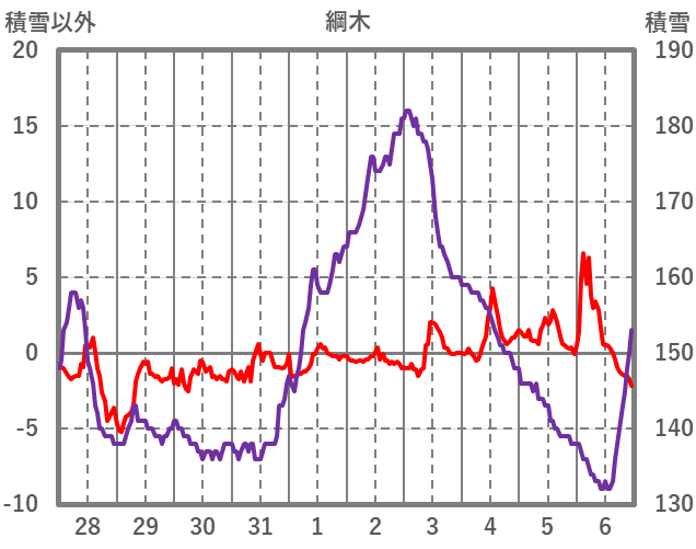 | 日 | 時 | 気温 | 降水 | 風向/風速 | 日照 | 積雪 | 降雪 |