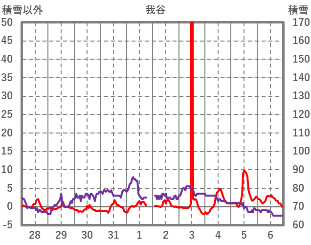 | 日 | 時 | 気温 | 降水 | 風向/風速 | 日照 | 積雪 | 降雪 |