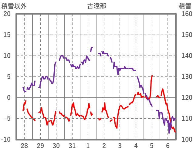 | 日 | 時 | 気温 | 降水 | 風向/風速 | 日照 | 積雪 | 降雪 |