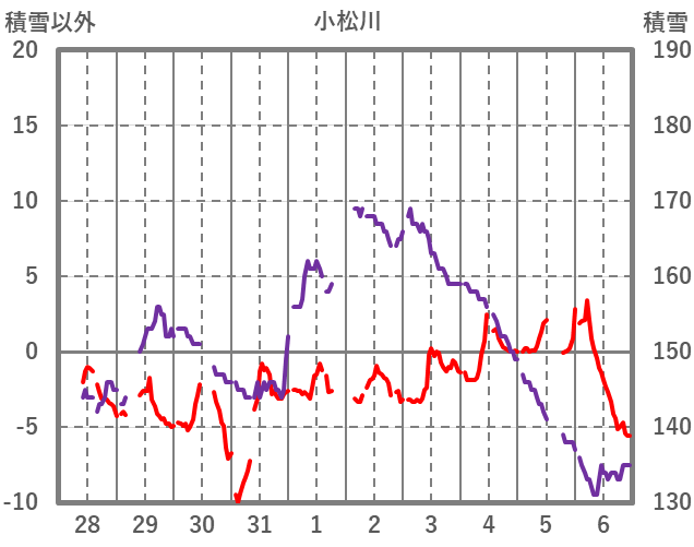 | 日 | 時 | 気温 | 降水 | 風向/風速 | 日照 | 積雪 | 降雪 |