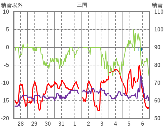 | 日 | 時 | 気温 | 降水 | 風向/風速 | 日照 | 積雪 | 降雪 |