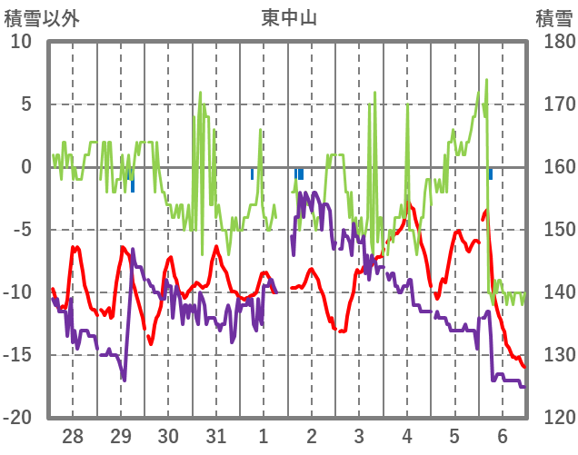 | 日 | 時 | 気温 | 降水 | 風向/風速 | 日照 | 積雪 | 降雪 |