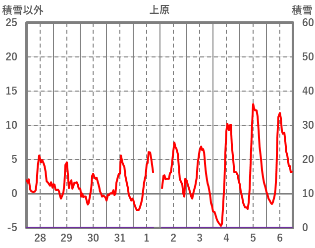 | 日 | 時 | 気温 | 降水 | 風向/風速 | 日照 | 積雪 | 降雪 |
