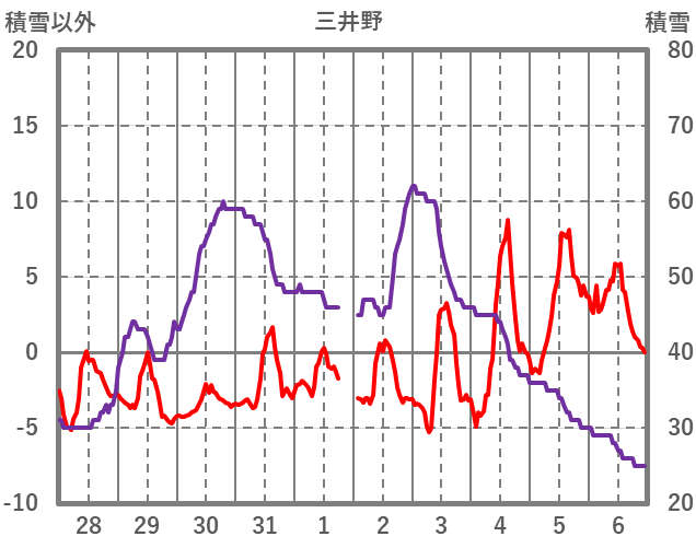 | 日 | 時 | 気温 | 降水 | 風向/風速 | 日照 | 積雪 | 降雪 |