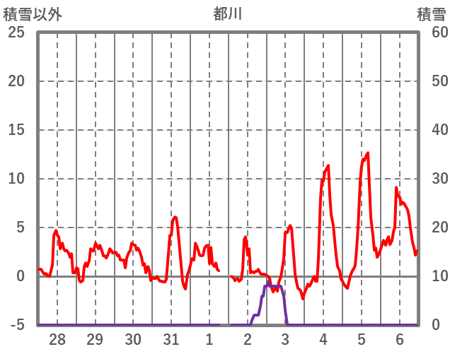| 日 | 時 | 気温 | 降水 | 風向/風速 | 日照 | 積雪 | 降雪 |