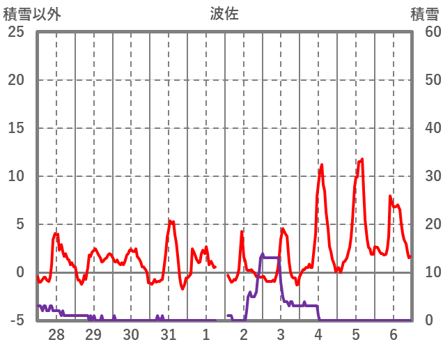 | 日 | 時 | 気温 | 降水 | 風向/風速 | 日照 | 積雪 | 降雪 |