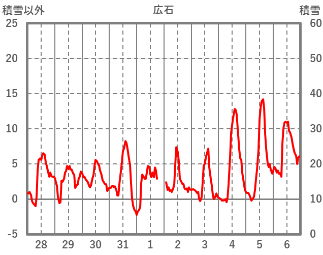 | 日 | 時 | 気温 | 降水 | 風向/風速 | 日照 | 積雪 | 降雪 |