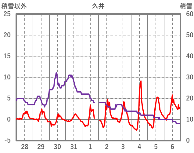 | 日 | 時 | 気温 | 降水 | 風向/風速 | 日照 | 積雪 | 降雪 |