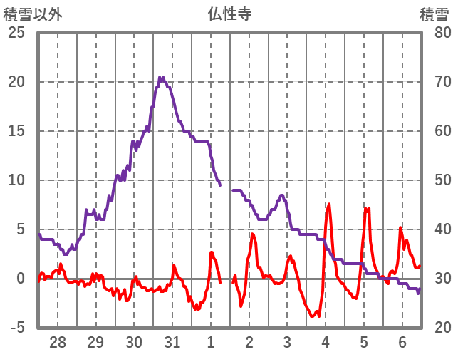 | 日 | 時 | 気温 | 降水 | 風向/風速 | 日照 | 積雪 | 降雪 |