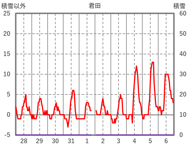 | 日 | 時 | 気温 | 降水 | 風向/風速 | 日照 | 積雪 | 降雪 |