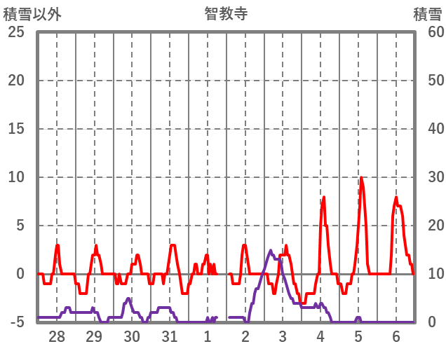 | 日 | 時 | 気温 | 降水 | 風向/風速 | 日照 | 積雪 | 降雪 |