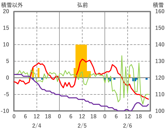 | 日 | 時 | 気温 | 降水 | 風向/風速 | 日照 | 積雪 | 降雪 |