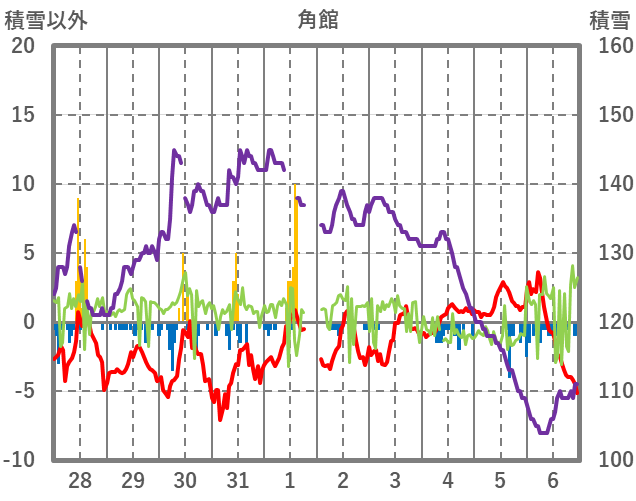 | 日 | 時 | 気温 | 降水 | 風向/風速 | 日照 | 積雪 | 降雪 |