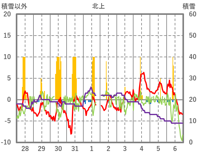| 日 | 時 | 気温 | 降水 | 風向/風速 | 日照 | 積雪 | 降雪 |