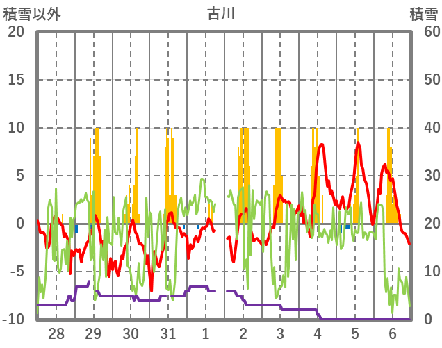 | 日 | 時 | 気温 | 降水 | 風向/風速 | 日照 | 積雪 | 降雪 |