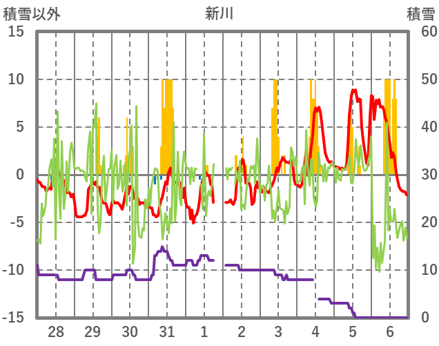 | 日 | 時 | 気温 | 降水 | 風向/風速 | 日照 | 積雪 | 降雪 |