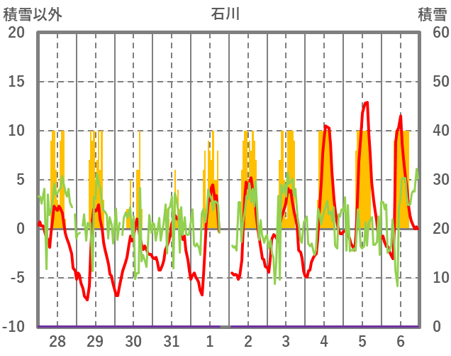 | 日 | 時 | 気温 | 降水 | 風向/風速 | 日照 | 積雪 | 降雪 |
