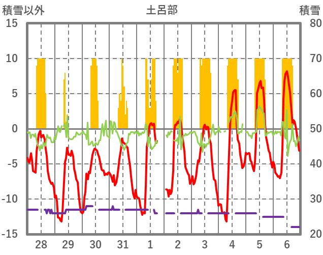 | 日 | 時 | 気温 | 降水 | 風向/風速 | 日照 | 積雪 | 降雪 |